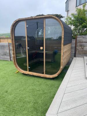 Stunning Hekla Cube 160, 210, 250 Saunas for 2, 4 or 6 people, Skandi styule outdoor saunas with elecrtric heating or a wood burner options.
